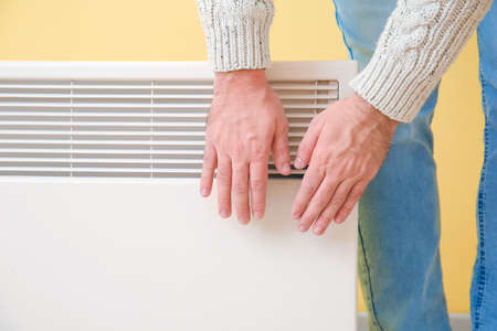 Young man warming hands near electric heater. Concept of heating season