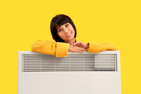 Young woman with radiator on yellow background