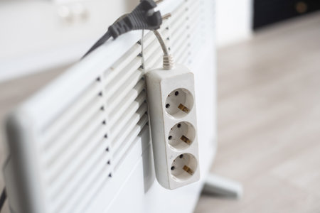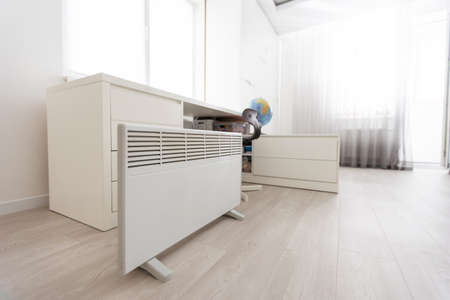 Heater convector. Smart Home with the smart heating system. Electric panel heating concept. Domestic electric heater, home convector plugged the cord with plug to electricity. Electric radiator