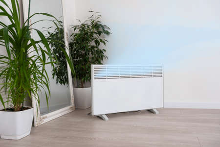 Modern electric convection heater on floor at home. Space for text