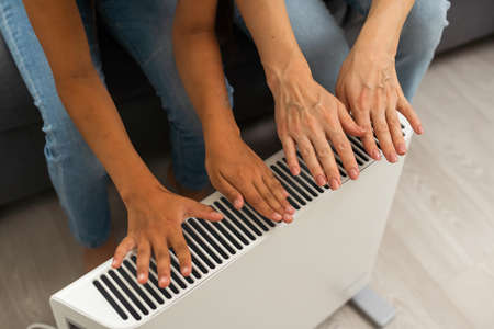 Family warming hands near electric heater at home, closeup