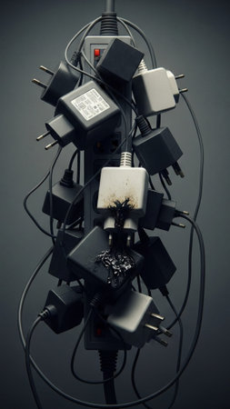 In a dark, cluttered room, a power strip is pushed beyond its limits, its sockets glowing with a dangerous red light.