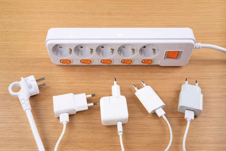 The electrical extension strip with connected white power plugs on the wooden table. Smartphones chargers in power strip for electrical sockets