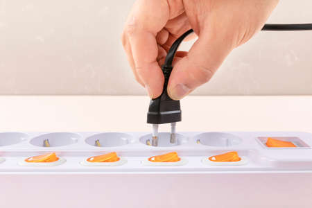 Close up Hand holding Electric plug put on multiple socket. Electrical equipment, electrical wires and power strips in the house. Earth Hour saving electrical energy.