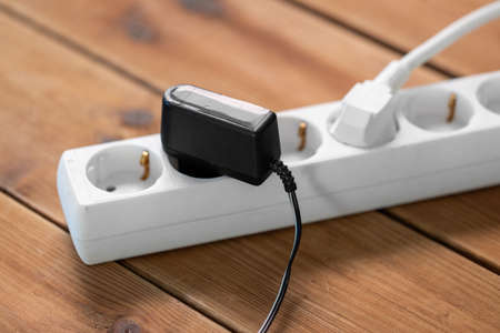 The electrical extension strip with connected white and black power plugs on the wooden table. Smart phones chargers in power strip for electrical sockets