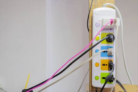 Overloaded power socket plug extendion at home. Tangled cords of home appliances and chargins gadgets mess.