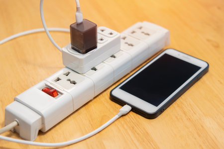 Smartphone, mobile phone chargers connected to electrical power strip. Various devices charging concept