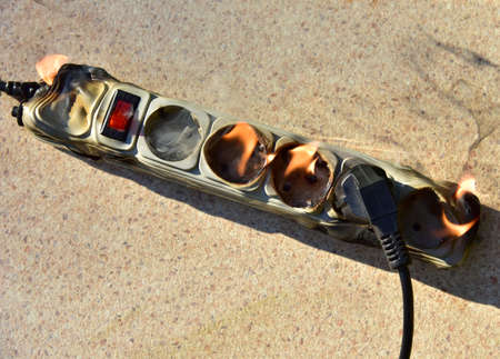 Outlets with switche caught fire in room. Overloaded electrical current or short in device from many devices connected. Fire in socket of electric circuit causing. Burned plug with wire.