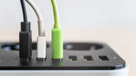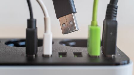 Modern convenient multi-port usb charger for devices. Close-up of inserted multi-colored cables in a power outlet. Macro.