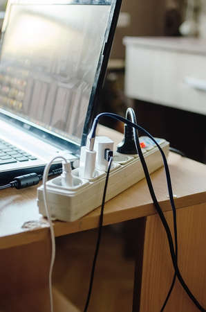extension socket with various chargers and devices connected. Freelancer workplace at home. Vertical photography.