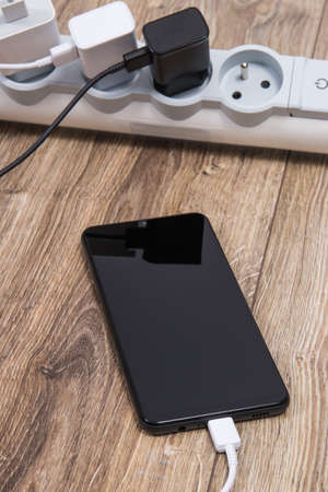 Black smartphone, mobile phone and chargers connected to electrical power strip. Various devices charging concept