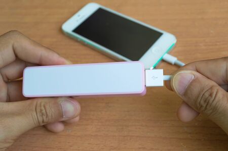Man charging smartphone with power bank.