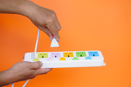 Close up hands hold electric power plug and pulling out from portable socket. isolated on orange background. Concept, save electricity power.Campaign to plug off after finish