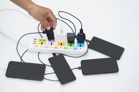 Hand hold mobile phone connected to charging hubs on electric socket. Concept, too many devices plugged in can cause severe damage with appliance as electric shot. Overloaded