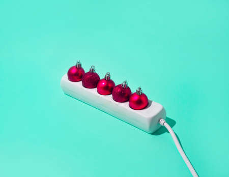 Red Christmas decorations in the extension cord. Festive minimal idea on a blue-green background.