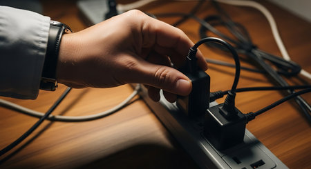 Close-up of a man's hand holding a power strip on a wooden table