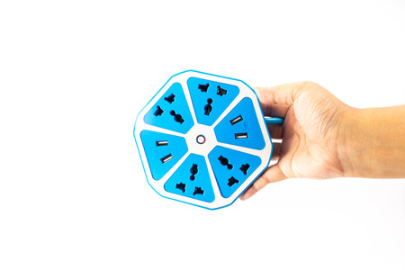 Blue Hexagon electric outlet with USB socket port connector on hand of man isolated on white background