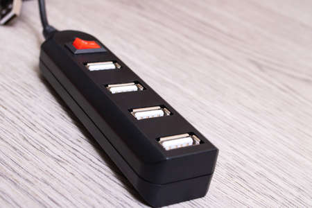 Black USB hub on a wooden background close up