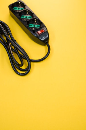 Electrical power strip and plug on green background. Top view