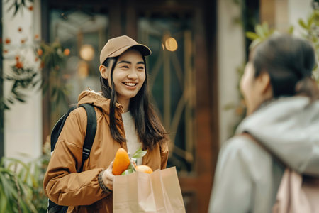 A young woman deliverer carrying a bag of groceries, exchanging greeting with a customer at their doorstep, seamless home delivery service.