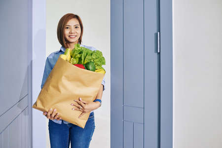 Portrait of happy young Asian woman carrying paper bag with fresh groceries