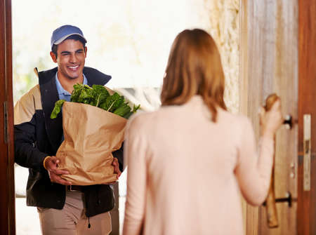 The perks of same-day delivery. a courier making a delivery to a customer at her home.