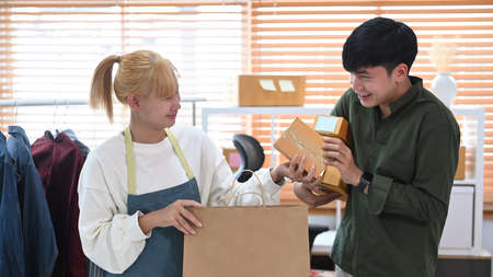 Two young asian couple preparing parcel box of product for deliver to customer. Online selling concept.