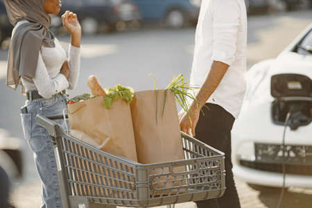 Multi ethnic couple charge elctric car after shopping