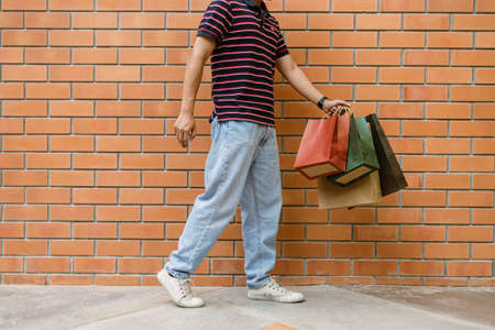 shopping concept The guy with his colorful shopping bags walking along the street near the building while glancing at something opposite to him.