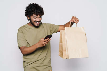 Young middle eastern man with shopping bags using cellphone isolated over white wall