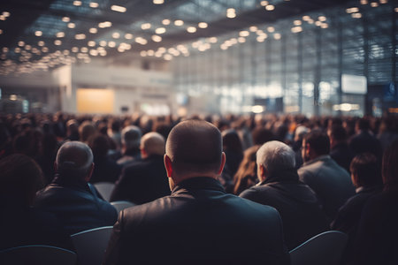 rear view of an audience in a conference hall listening to a business speaker