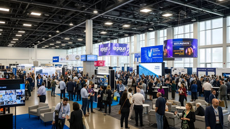 Vibrant trade show bustling with crowds, colorful displays, and bright lights in a modern venue