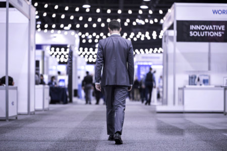 A man in a suit walks away from the camera down a carpeted aisle in a large convention center with numerous booths and attendees blurred in the background.