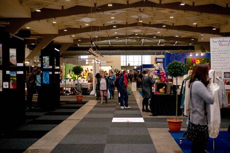 Toronto, ON, Canada - November 14, 2025: Visitors exploring the indoor exhibition hall at The Royal Agricultural Winter Fair, with an information booth and sponsor banner visible