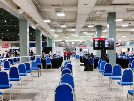 Selangor, Malaysia - July 6,2021 : Public people can seen waiting patiently in the hall for their turn to take the vaccine Sinovac at MIECC Seri Kembangan.