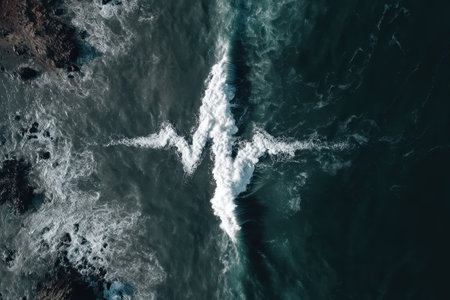 An abstract interpretation of the ocean's waves shaped like a heartbeat line, captured from an aerial perspective. The dynamic motion brings a sense of tranquility and energy to any design theme.