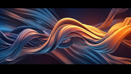 This image presents abstract ribbons in a dynamic composition. The ribbons feature a gradient of colors, transitioning from blue to gold, creating a sense of movement. The style emphasizes smooth textures and a fluid appearance. It could be suitable for various design projects, offering visual interest and aesthetic appeal for commercial uses.