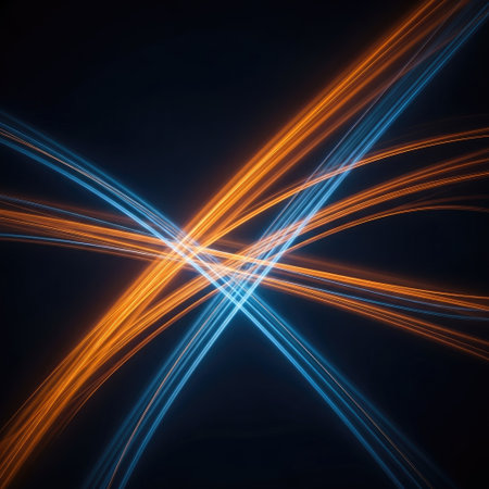 Dynamic composition presents intersecting light trails in vibrant orange and cool blue hues against a dark backdrop. The streaks create a sense of movement and energy, with glowing lines that suggest motion. Suitable for illustrating technology, digital art, or conceptual design themes with commercial applications.