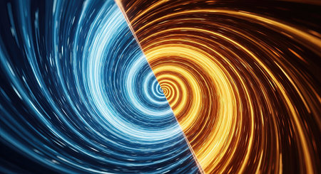 A captivating background featuring two contrasting swirling vortexes, one in radiant blue and the other in fiery orange, symbolizing energy, speed, and digital flow.
