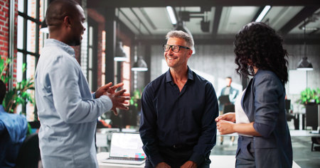 Smiling african american businessman talking with coworker in office