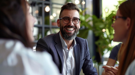 Business leader facilitating a team meeting, engaging employees in strategic discussion, emphasizing leadership and collaboration in a sleek office setting