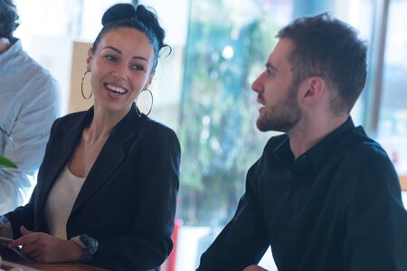 Young business people talking with each other about new projects at a coffee bar