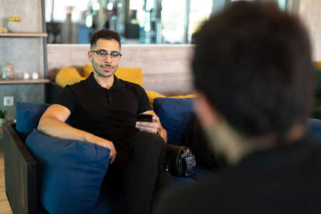 Handsome clever dark-skinned businessman talking about the benefits and results of the financial project to his team, multiracial business colleagues sitting on the comfortable sofas