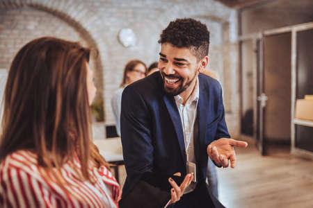 Group of young business people talking to each other and discussing new project together in team at office