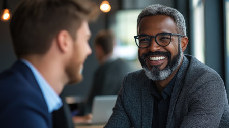 In a bright, modern workspace, two men share a joyful moment, exchanging ideas and laughter while holding coffee cups. Their friendly demeanor and stylish attire create an inviting atmosphere, perfect for collaboration and connection.