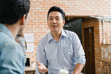 Happy young Asia businessmen and businesswomen meeting brainstorming ideas about new paperwork project colleagues working together planning success strategy enjoy teamwork in small modern office.
