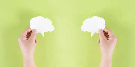 Two hands holding empty speech bubble and cloud bubble on gray background.