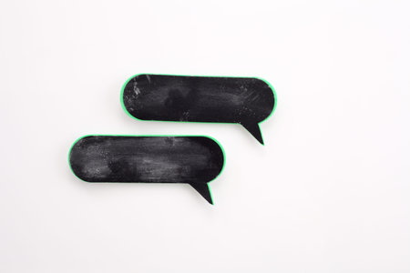 Top view of square chalk board speech bubbles on colored papers, metaphor, concept for communication