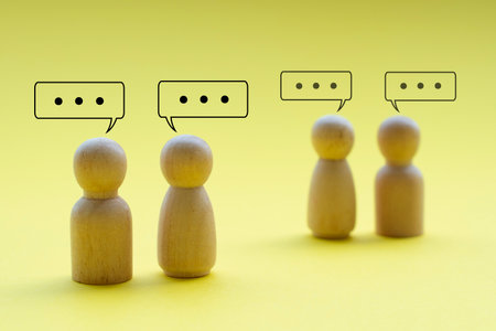 Wooden figures talking to each other on yellow cover background representing networking or having business dealings.