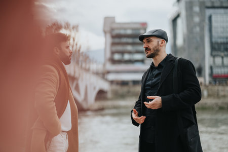 Outdoor shot of two males in a deep discussion, dressed in winter attire with a blurred cityscape and river behind them.